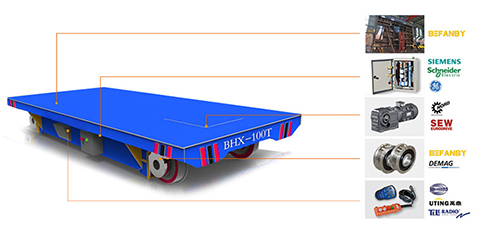 BHX:采用滑觸線將380V交流電源引入平車作為該平車的電力來源,其運行頻率和使用時間不受限制,適用于較長距離運輸的場合?;|線安裝平車底部或兩側,會對其他車輛的過往造成影響,但因其臺面較低,卻是流水線生產的 輸送設備。